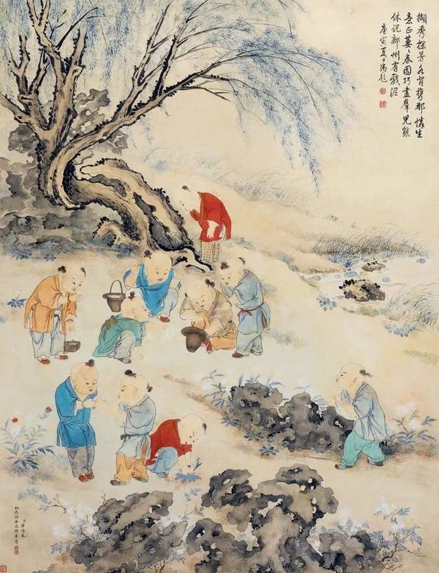 本幅乾隆皇帝(1711-1799)题:撷秀探芳各背携,那怜生意正萋萋。春园巧画群儿态,休说鄜州有戏泥。庚寅(1770年)夏日,御题。?钤印:乾、隆(参见《清代帝后玺印谱·乾隆卷》18页)