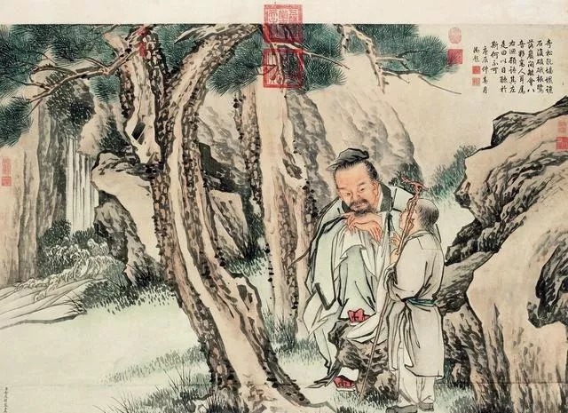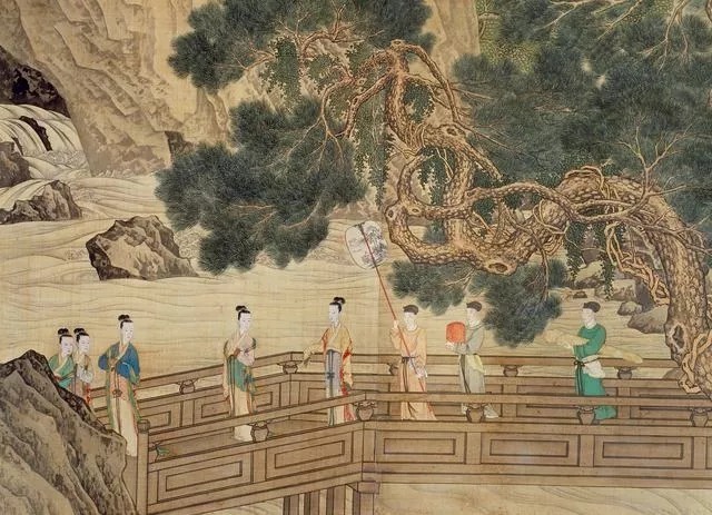 这幅中西合璧的画作,正是乾隆皇帝的爱将金廷标与西洋画家郎世宁合作的产物。《乾隆宫中行乐图》这幅画作中,上面的山水、木石、雕梁画栋都是由金廷标完成,而画中的人物和动物,是郎世宁利用西方的人像绘制方法,将乾隆皇帝、妃嫔和山石宫中的仆人们绘制到画卷中。画卷中的松树笔法工整精妙,有宋朝绘画之风,山石则多为侧锋皴擦,有峭拨风骨和石头应有的坚硬之感,从这幅画作来看,金廷标的山水画功底的确不浅,堪称绘画大师。