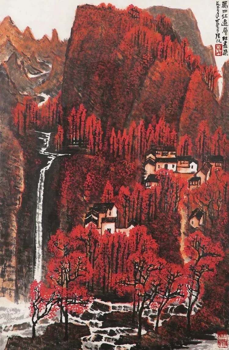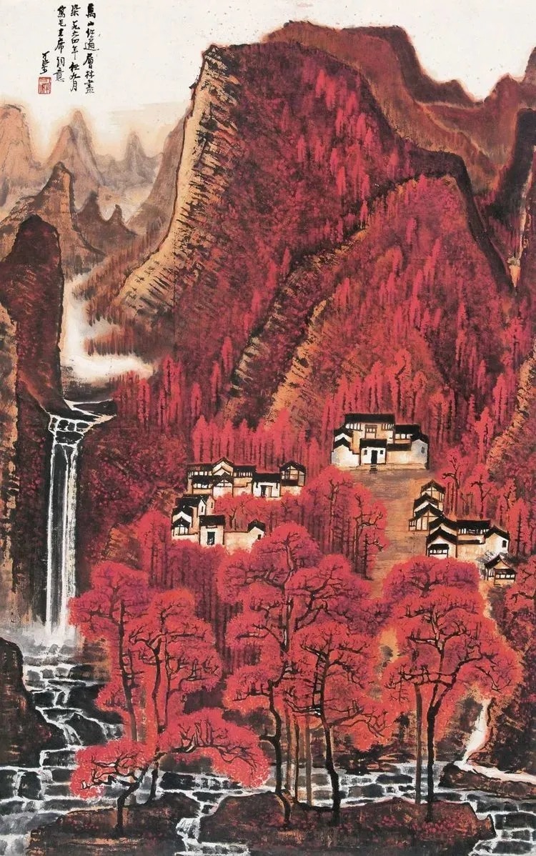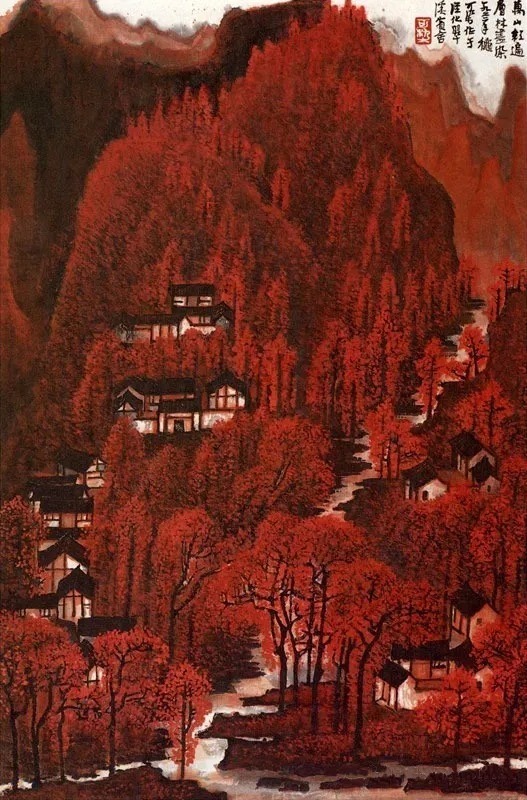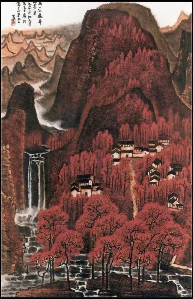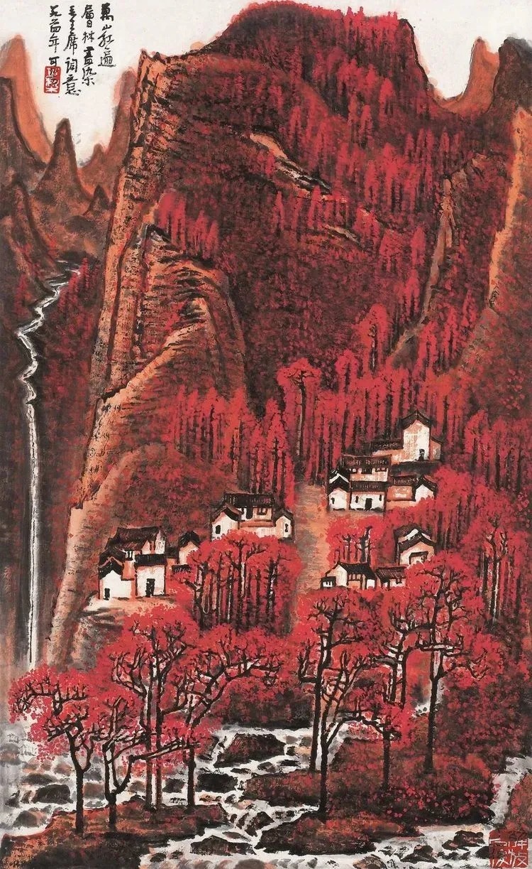 这幅画左上角的文字说明:“山遍红,林遍染。毛主席话的意思,可染于1964年.”