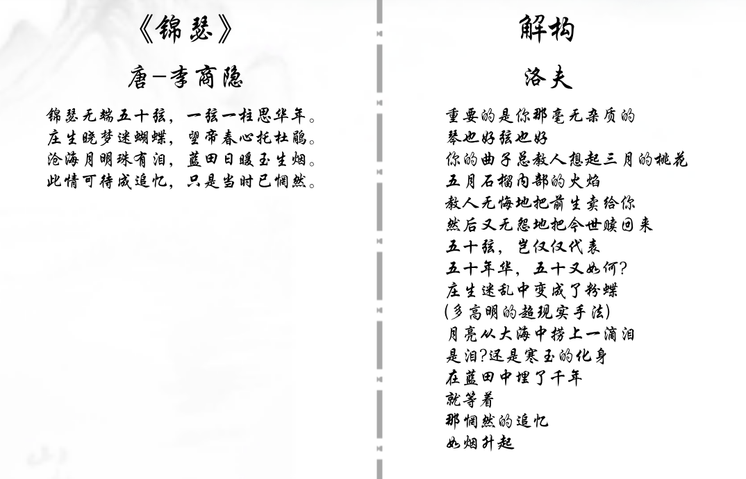 洛夫的解构现代诗,完全是他对《锦瑟》的理解,确实挺有见地。首先,对于“庄生”和“蝴蝶”这两个意象,他解出了新意。但他的重点在于“沧海月明珠有泪”的解读上,岁月的沧桑加上空间的变幻,洛夫这首诗都一一提到,充满了辩证思维。作为一首现代诗,它继承了李商隐朦胧的诗境,这是很重要的。