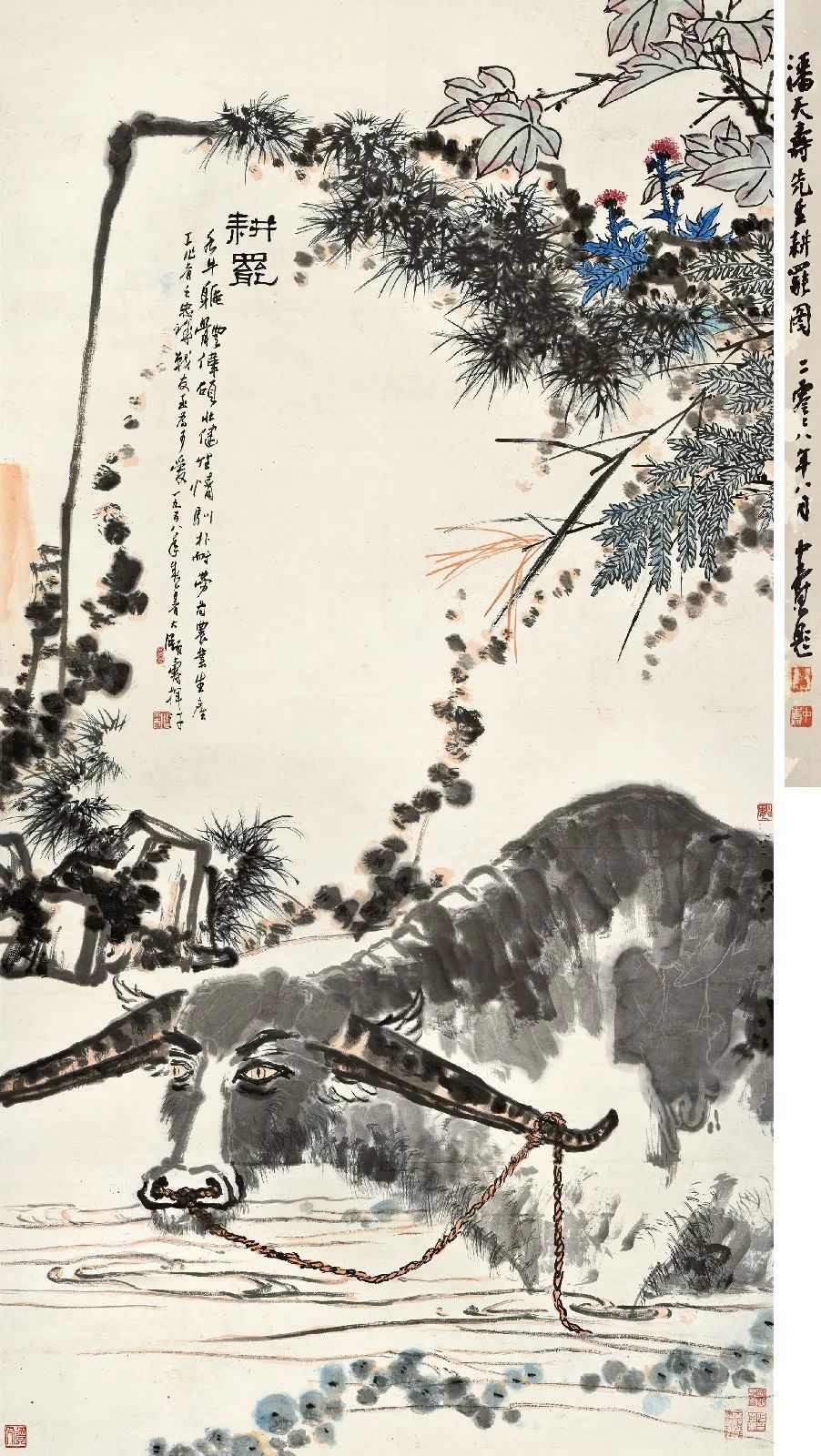 近年拍卖市场关于牛的名家画作时有上拍,有些还拍出惊人的天价。2011年北京保利秋拍,徐悲鸿《九州无事乐耕耘》拍出2.66亿元天价。2017年中国嘉德春拍,潘天寿1958年作《耕罢图》以1.589亿元成交。2018年北京保利秋拍曾咨询价上拍一件潘天寿1961年作《春塘水暖》,但最后流拍。2020年华艺国际(北京)首季拍卖会,三年前在嘉德1.58亿成交的《耕罢》再次上拍,最终以1.78亿元成交。